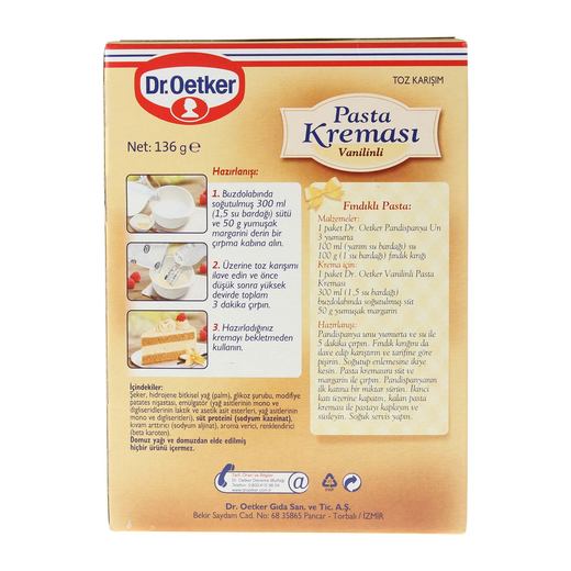 Dr oetker pasta kreması yapımı. Dr oetker pastacı kreması poşetinin arka yüzünde birbirinden lezzetli ve albenili pasta dolgulu çörek ekler tart tartolet ve karpatka gibi tarifler bulunuyor. Dahil olduğu tatlı tariflerine sınıf atlatma garantili 11 fa. Dr oetker vanilyalı pasta kreması 140 g. Pasta kaplamak için krem şanti çırpılmış süt kreması veya pasta kreması kullanılabilir.