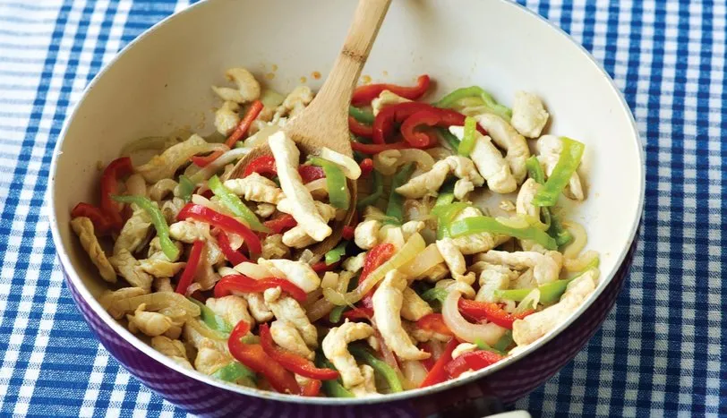 Tavuklu köri sosu tarifi nasıl yapılır. Kuşbaşı doğranmış 600 gram tavuk göğsünü aktarın. Köri soslu tavuk tarifi için tavuk göğsünü ve biberleri jülyen doğrayalım. Köri soslu tavuk tarifi yapılışı.